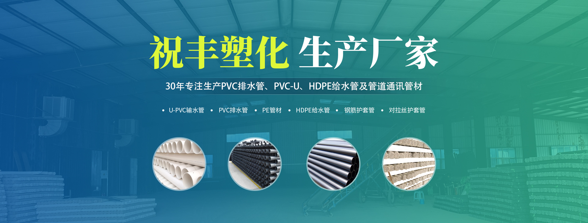 安陽市祝豐塑化有限公司坐落在滑縣工業(yè)園區(qū),東臨大廣高速,西臨京珠高速,是鄭州、鶴壁、安陽、濮陽四個城市的輸紐,交通便利、環(huán)境優(yōu)美。       公司始建于八十年代,經(jīng)過二十余年的艱辛創(chuàng)業(yè),規(guī)模不斷壯大,由十多萬元資產(chǎn)的小廠,發(fā)展到現(xiàn)占地面積達(dá)一萬多平,建筑面積一萬平,資產(chǎn)2000多萬元管材生產(chǎn)企業(yè)。公司生產(chǎn)PVC-U、PVC排水管、HDPE給水管、鋼筋護(hù)套管管道通訊管材等產(chǎn)品,廣泛用于農(nóng)田節(jié)水、高山引水、人畜用水、建筑、電力通訊等多種用途,品種齊全。為了滿足用戶需求,可承攬各種給水、節(jié)水、灌溉工程?!白XS塑化”憑借強(qiáng)勁的實力,優(yōu)良的管理水平?!耙再|(zhì)量求生存,以信譽(yù)求發(fā)展”的原則全力以赴和大家共同塑造美好未來。..